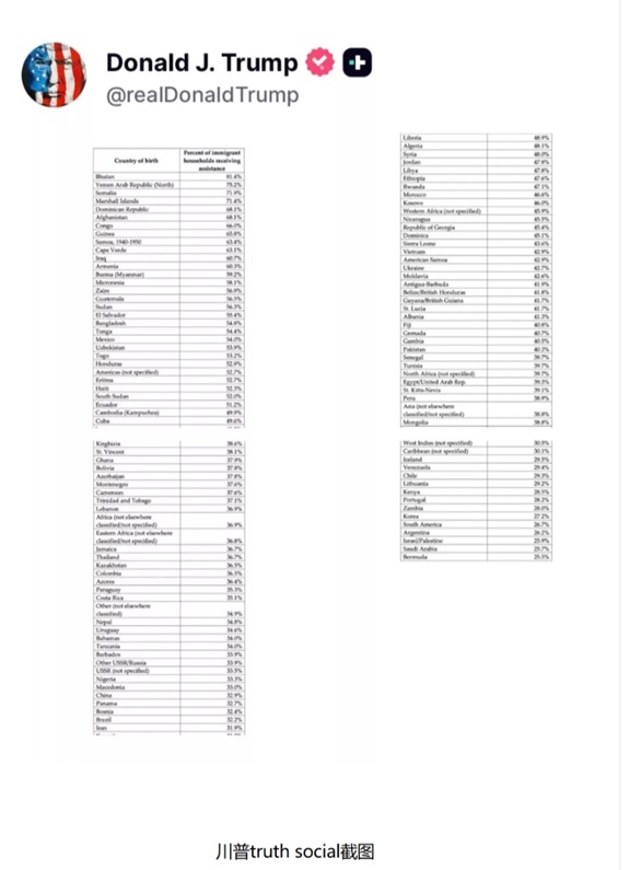 这张图表题为《按原籍国划分的移民福利领取率》,发布于川普自创的社交平台 Truth Social,涵盖约120个国家和地区。图表列出了来自各个国家、出生于当地的移民家庭中,领取某种形式政府援助的比例。