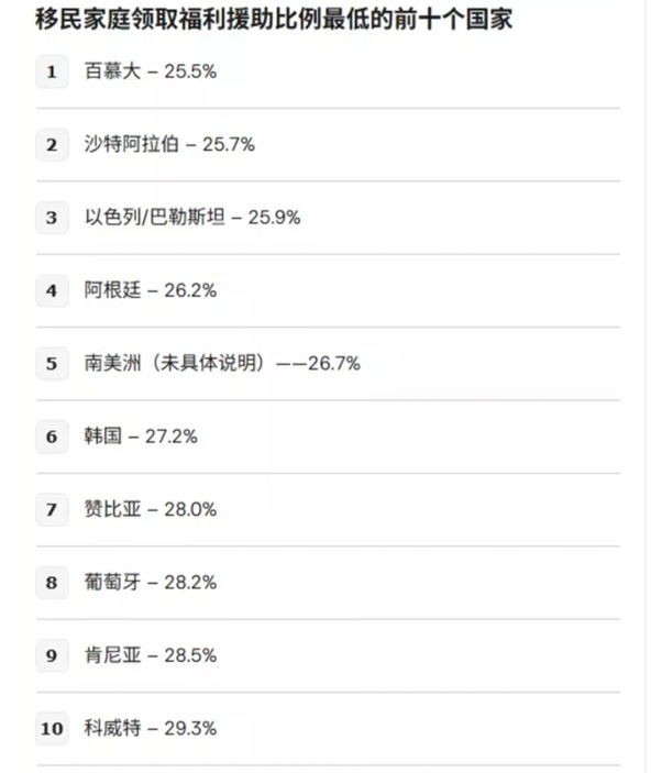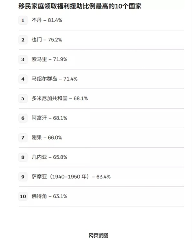 根据川普分享的数据,一些国家的移民家庭福利领取率非常高。不丹位居榜首,81.4%的移民家庭领取援助。
